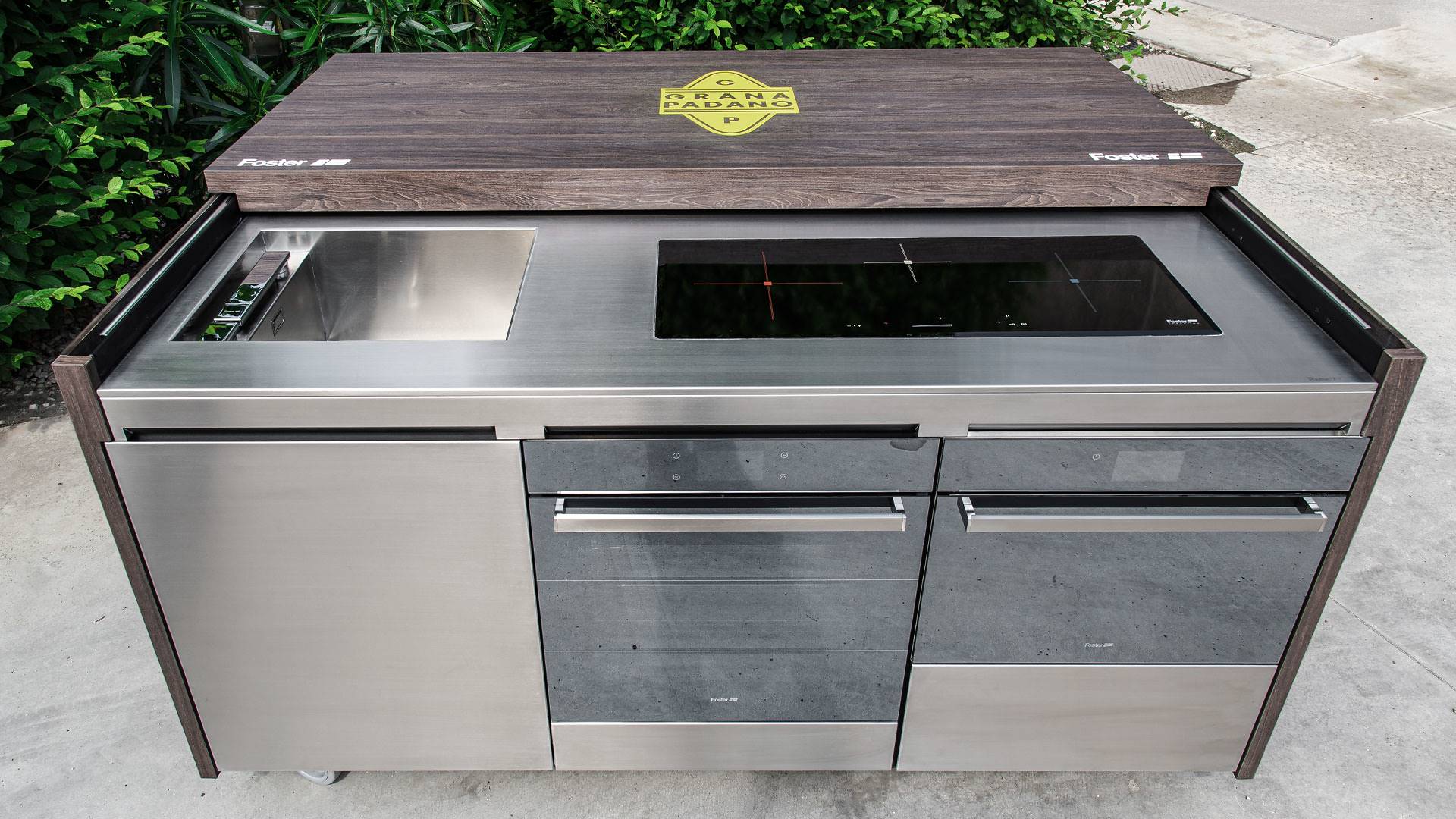 Foster InsiemeLa nouvelle cuisine sur roues est équipée d'un couvercle coulissant prêt à être transformé en une table confortable, une fois la cuisine mise en service.